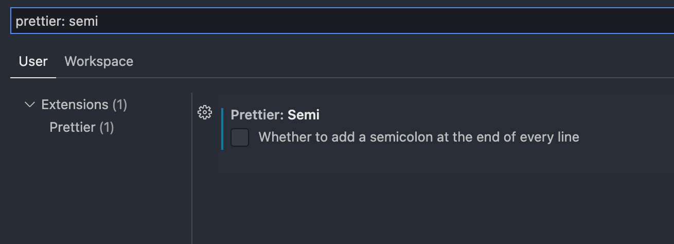 Prettier: Semi 설정을 찾아 체크 해제 해 줍니다.