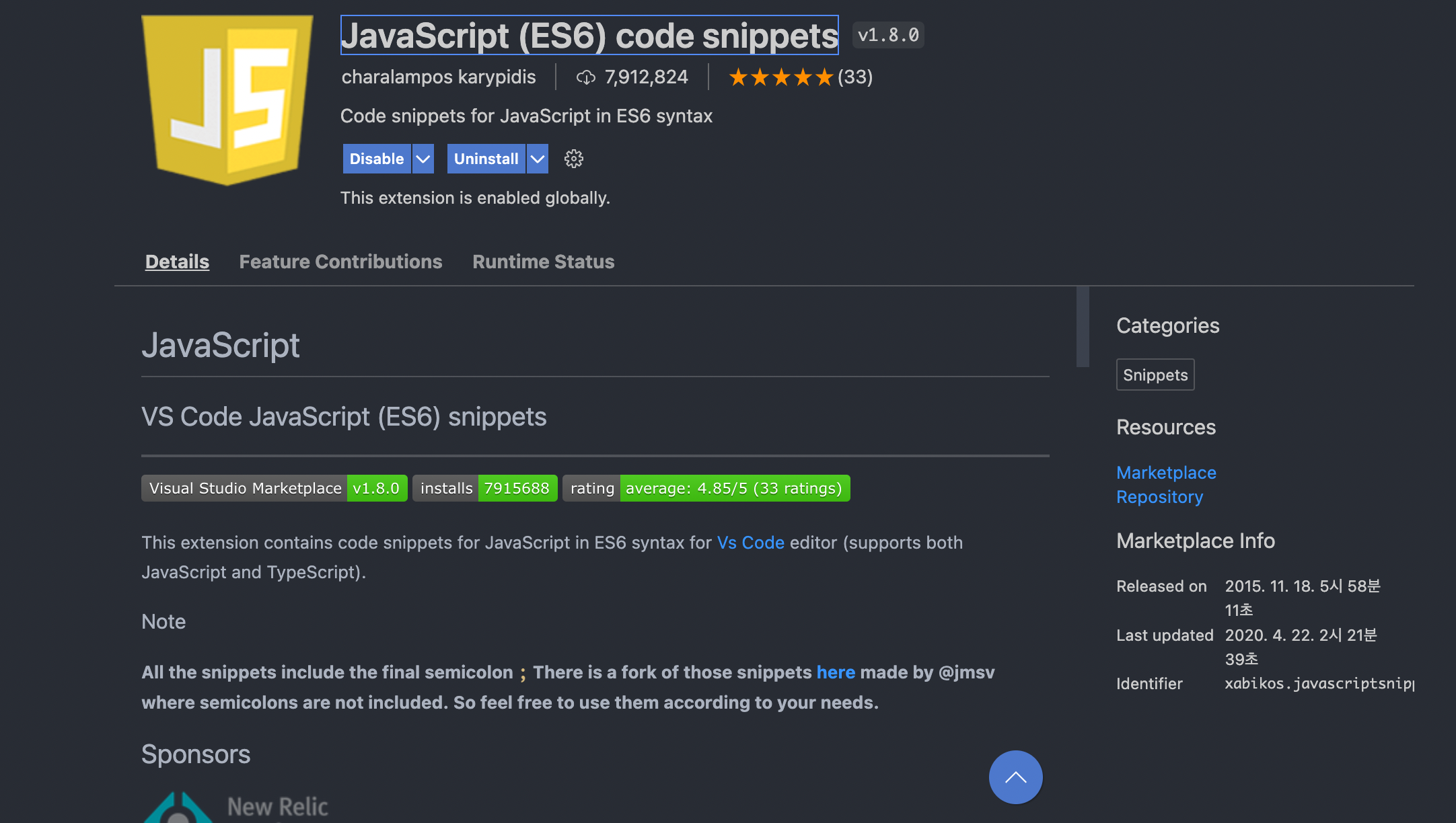 사용하는 다른 익스텐션도 많으나, Node.js와 관련이 적으므로 이하 생략.