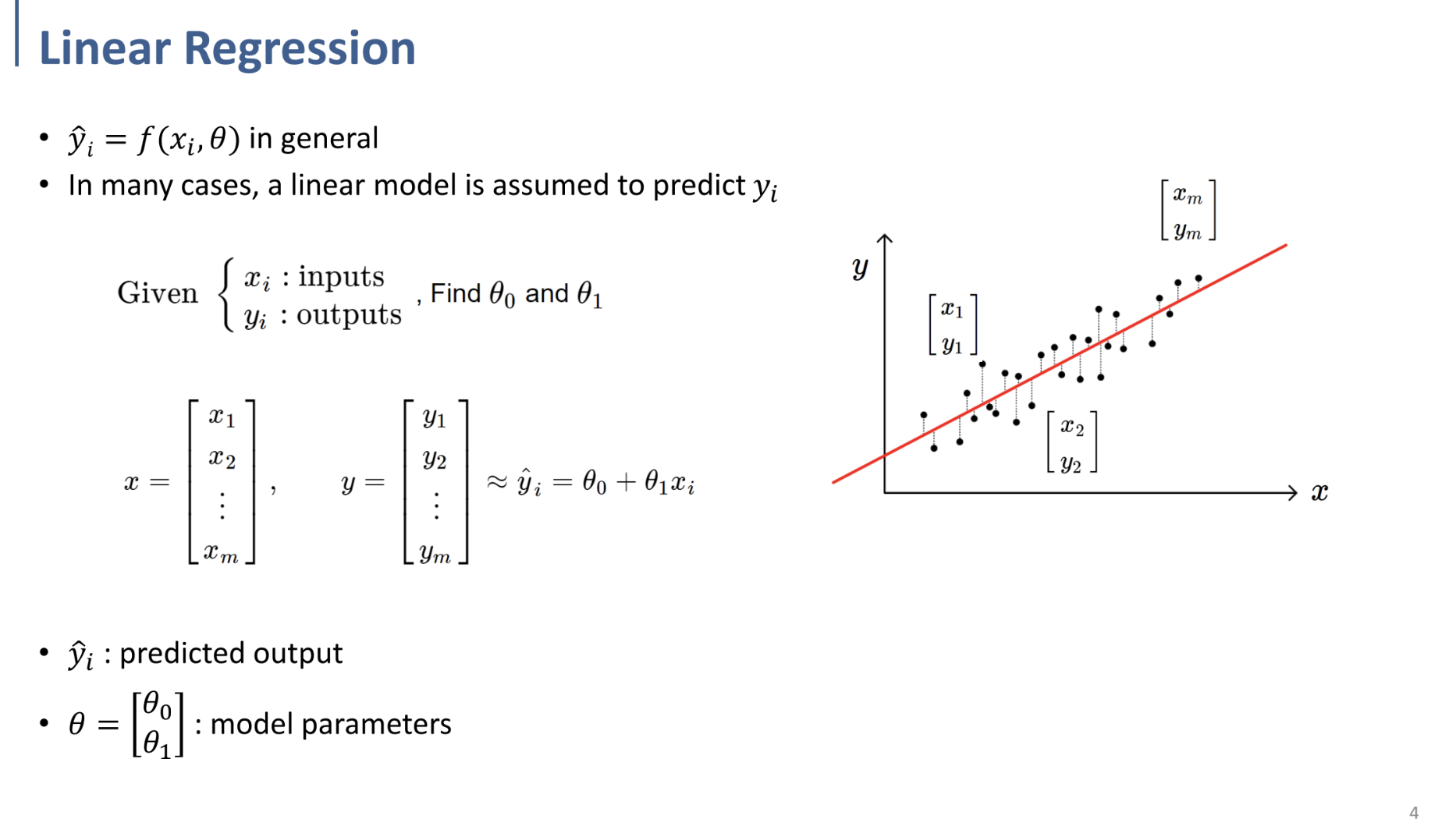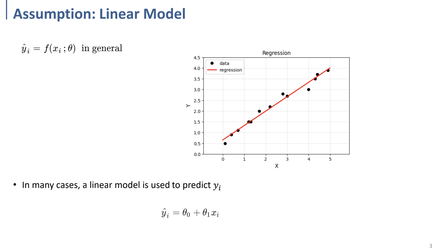 $y_i$를 가장 잘 predict(예측)하기 위한 linear model인 $f(\theta)$ (여기선, $\theta_0, \theta_1$)을 찾는 것
