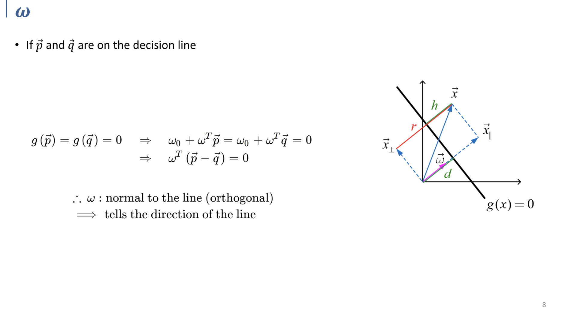 평면 상에서 $\vec\omega$가 위의 이유로 직선에 대한 법선벡터(orthogonal함)임을 확인할 수 있다.