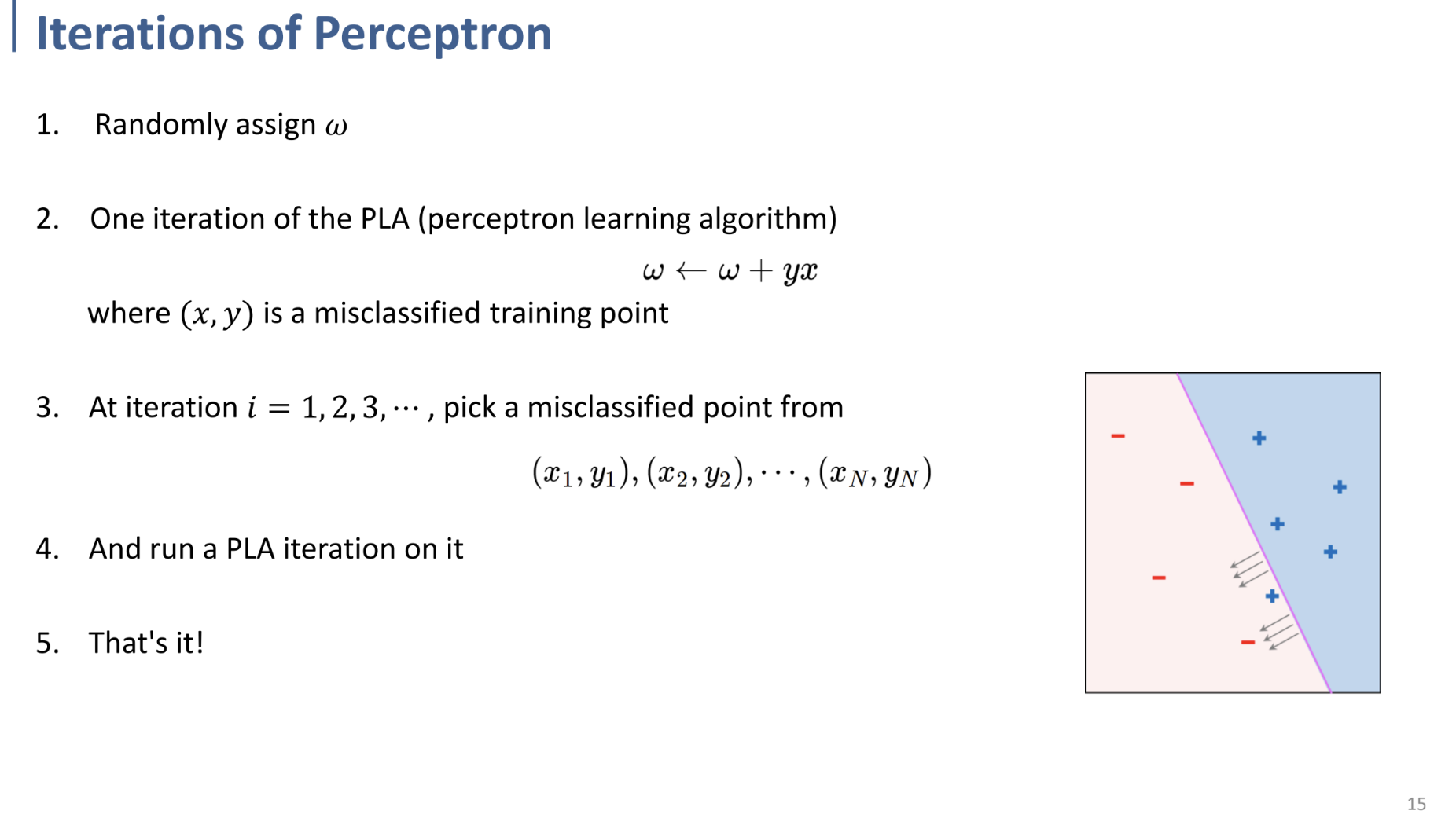 - $\omega ← \omega + y_nx_n$을 통해 weight를 업데이트한다.