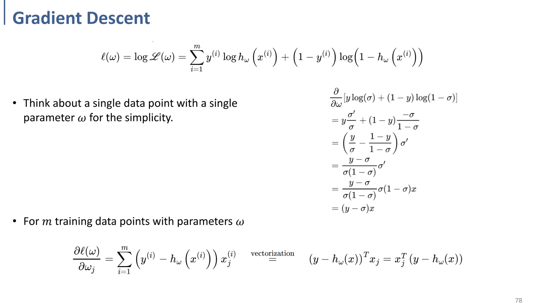 따라서 이를 적용하여 m개의 data에 대해 gradient를 계산하게 되면, vectorize하여 다음과 같은 결과로 정리됨. (1개의 data에 대한 결과를 일반화하여 vector 형태로 표현)