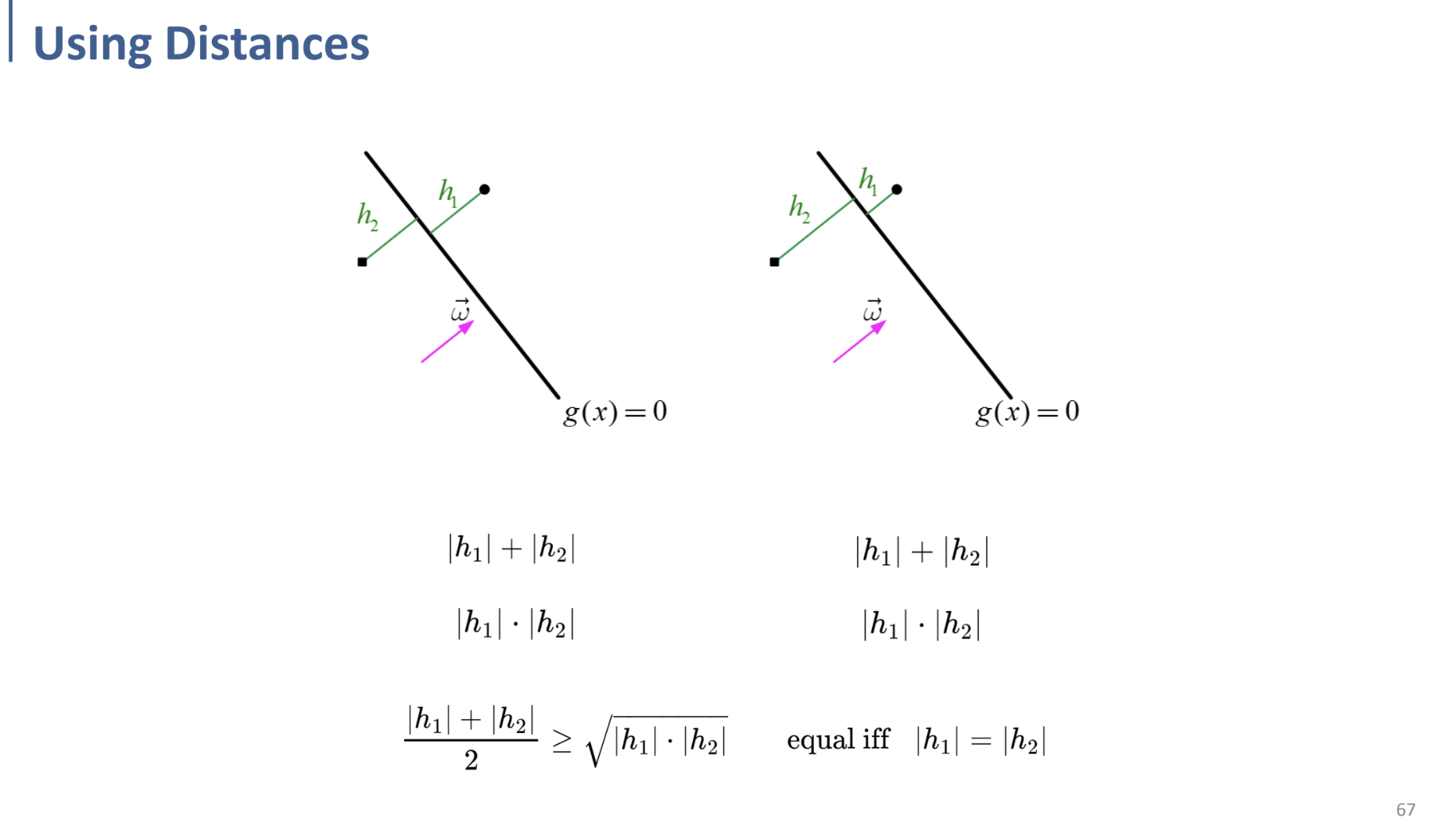 (아래의 산술기하평균부등식을 이용. 저 부등식이 같아지는 경우는 $h_1 = h_2$일 때. 따라서, maximize하는 Optimization 문제를 구성하면 → 같아질 때가 최대이므로, 딱 중간에 오도록 할 수 있음.)