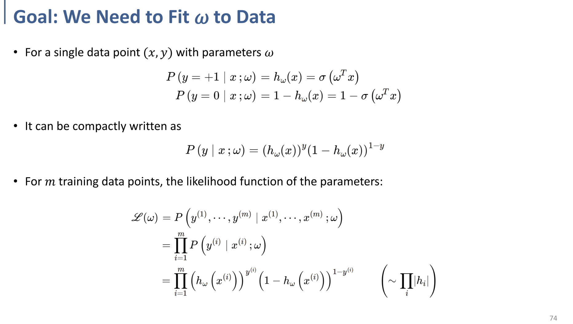 그러한 Sigmoid Function을 이용하여 parameter $\omega$를 fit(train)하는 식을 표현할 수 있다.