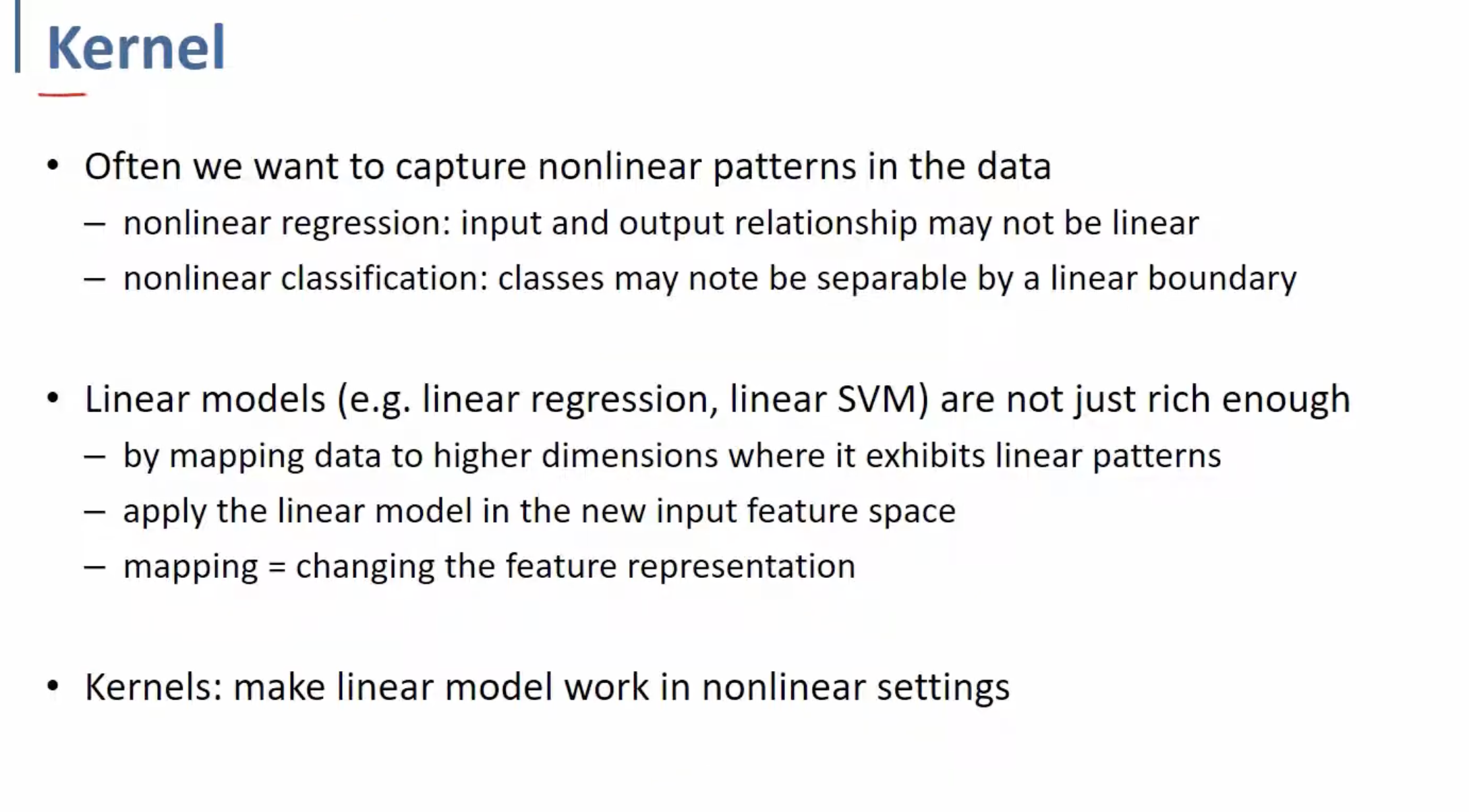 Kernel(mapping)을 통해 nonlinear pattern을 가진 data를 linear model에서 동작할 수 있도록 하는 것!