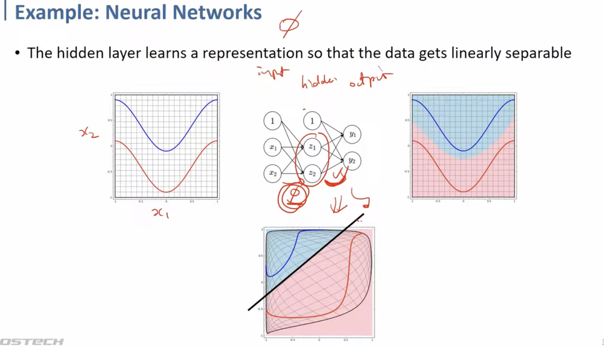 그래서 ANN에서는, 가운데의 hidden layer를 통해 data가 linearly separable하게 mapping되도록 represent하려면 어떻게 weight, bias를 설정해야 하는 지 학습하게 된다.