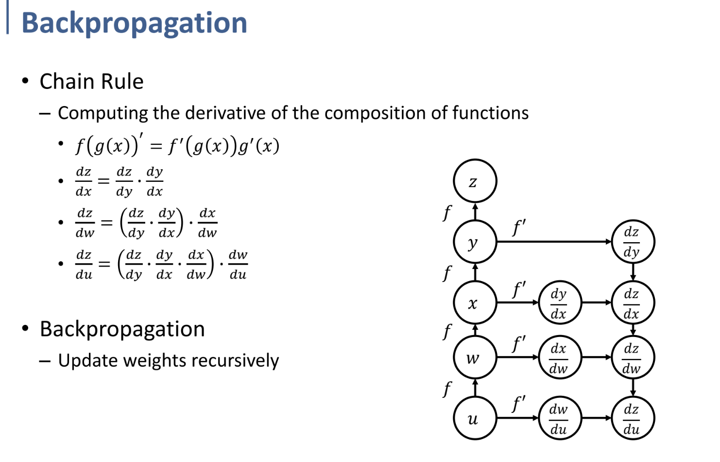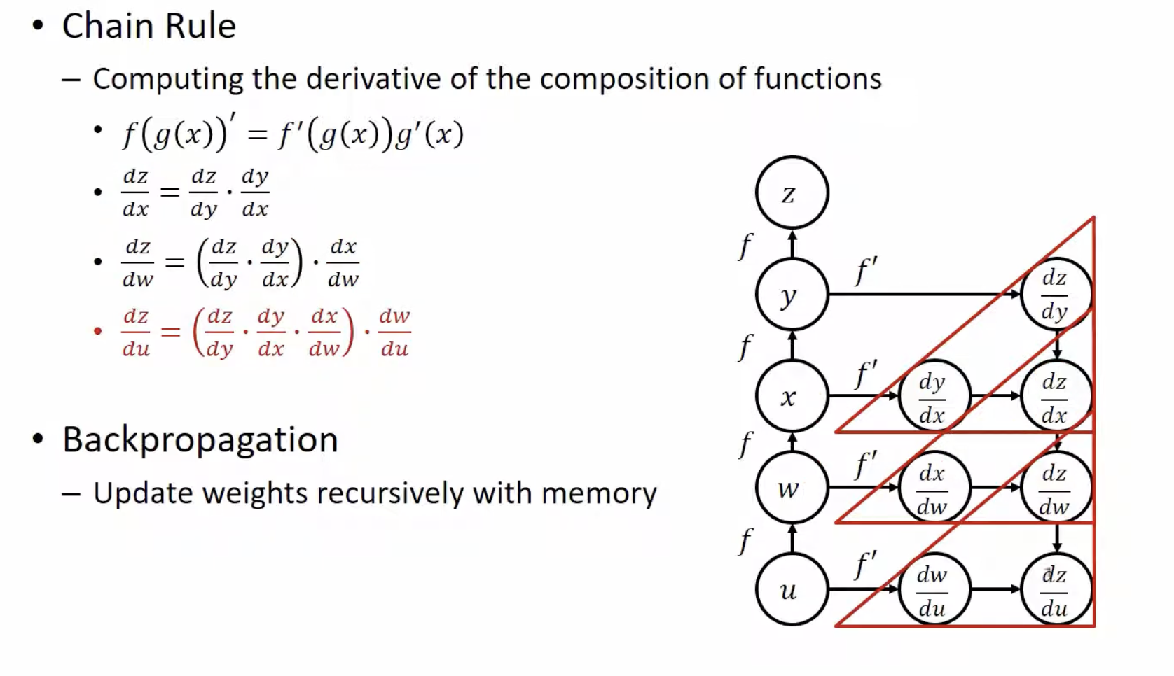 따라서 weight들이 모두 독립적이지 않으며, 각 구성 요소(layer)가 미분가능하므로 Chain rule을 적용할 수 있다.
