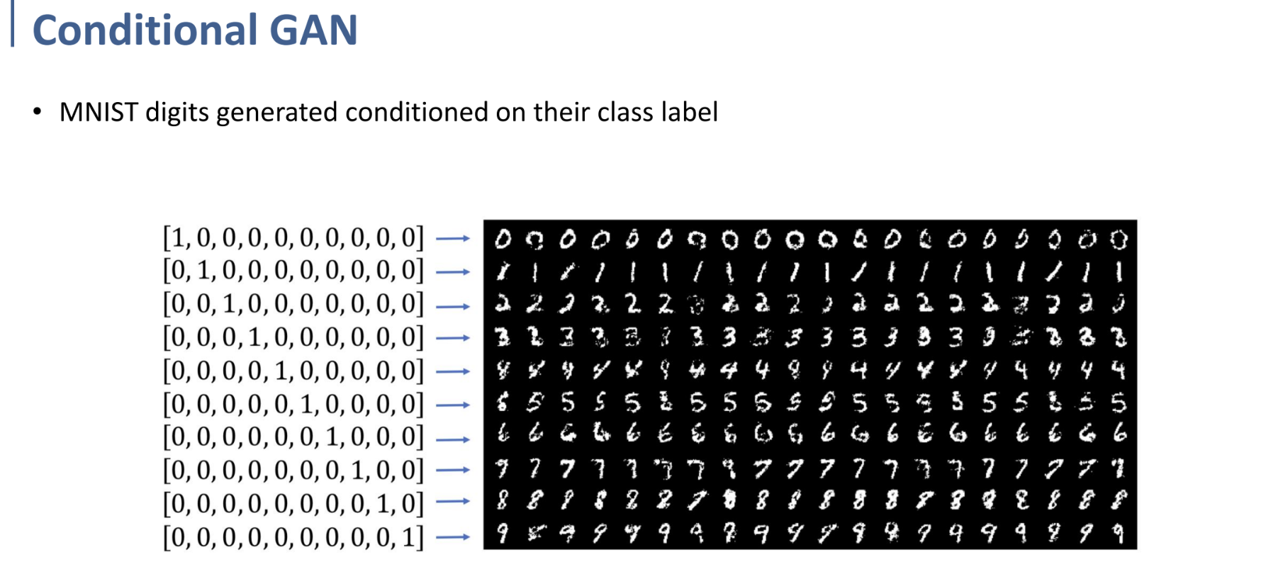 (MNIST dataset으로 예시를 든 경우이다. 왼쪽의 one-hot encoding된 condition을 추가로 넣어주면, 오른쪽과 같이 그 condition에 맞는 fake sample을 GAN이 생성하도록 학습한다는 것.)