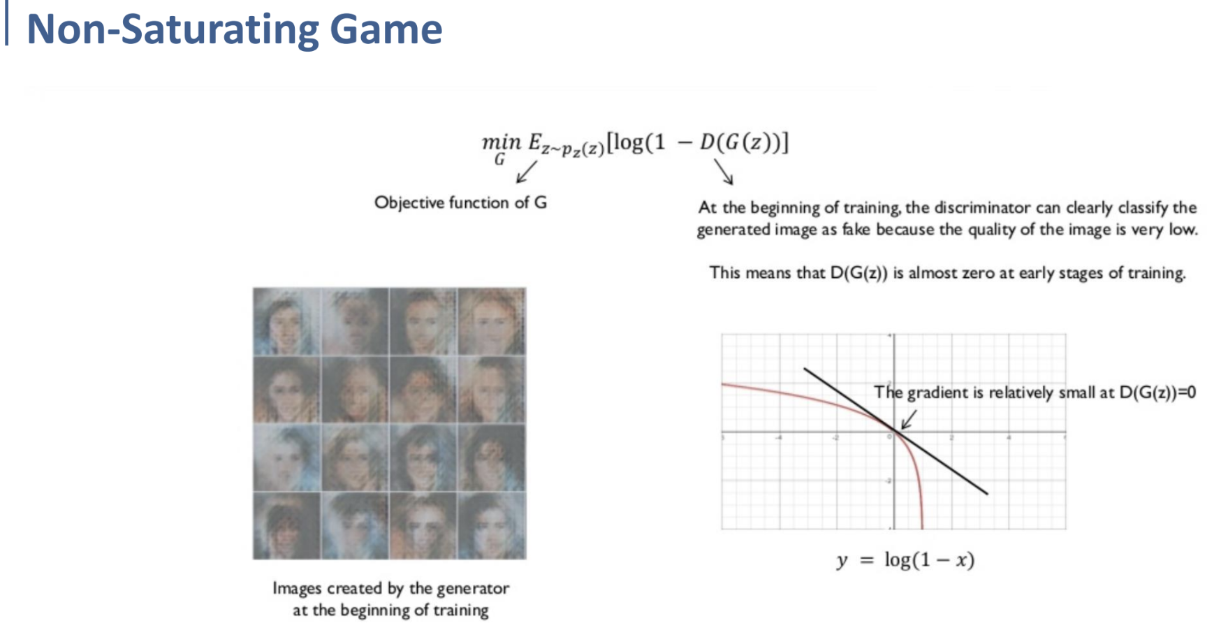 $\underset{G}{min} \ E_{z \sim p_z(z)} [\log (1 - D(G(z)))]$ 대신 $\underset{G}{max} \ E_{z \sim p_z(z)} [\log D(G(z))]$ 를 이용하자는 아이디어가 나왔다.