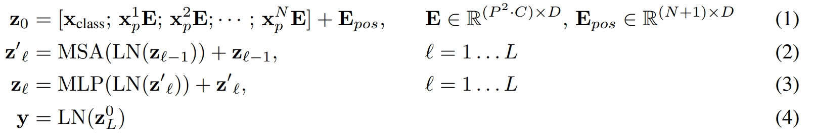 - Transformer Encoder는 Multi-head Self Attention(MSA) block과 MultiLayer Perceptron(MLP) block으로 구성한다. (그림 참고, Eq 2, Eq 3 참고.)
