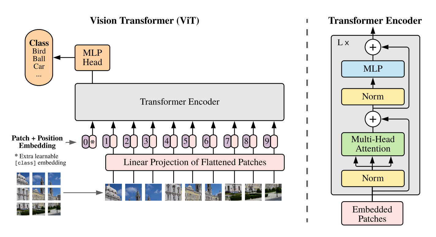 - ViT(Vision Transformer)의 구조는 위 그림(그림1)과 같다.