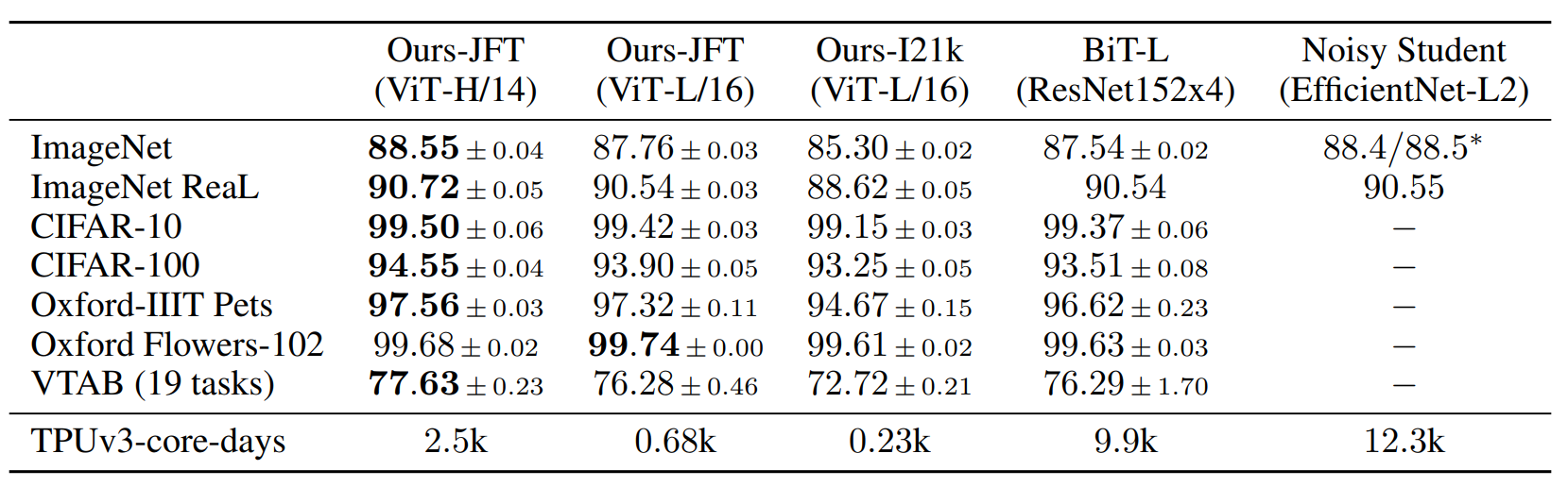 - 우선 이 표에서는 ViT의 가장 큰 모델 (ViT-H/14, ViT-L/16)을 이전의 SOTA 모델들 (ResNet을 이용한 BiT-L, Noisy Student)와 비교한다.