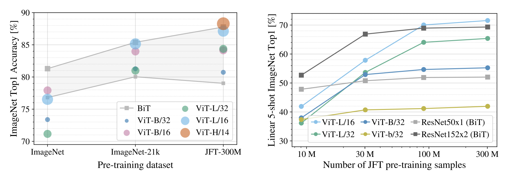 - ViT는 이전의 CNN 모델들보다 Inductive bias가 적기 때문에, Dataset의 크기에 영향을 크게 받는다.